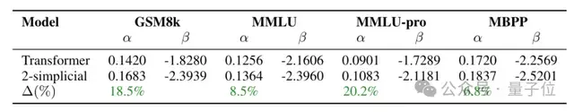 2-Simplicial Transformer的缩放指数α明显高于传统Transformer,说明模型性能随参数量、数据量的增加,变强速度更快。这也意味着,2-Simplicial Transformer在数据有限场景下优势会更加明显。