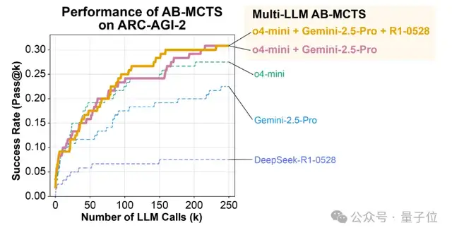 在具有挑战性的ARC-AGI-2基准测试中,AB-MCTS结合ChatGPT、Gemini和DeepSeek解决了30%的ARC-AGI-2谜题,而顶尖的独立模型仅解决了23%。