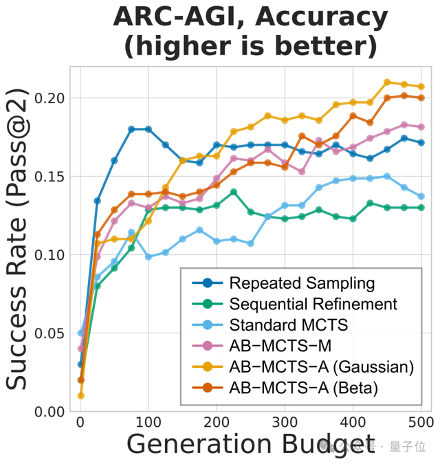 标准MCTS在增加预算后也继续改进,但与AB-MCTS方法相比,其成功率显著较低。这种性能差距表明,AB-MCTS在大型计算规模下更有效地将搜索导向搜索树中更有希望的分支。
