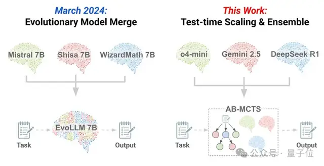 上述关于AB-MCTS的研究并非凭空产生,它基于Sakana AI 2024年在进化模型融合方面的工作,该团队将重点从“混合以创造”转向“混合以使用”现有的强大AI。
