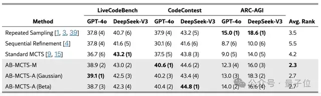 对AB-MCTS进行基准测试,结果显示,AB-MCTS在各种基准测试和LLMs中始终表现出色,获得的平均排名最高并优于既定基线。