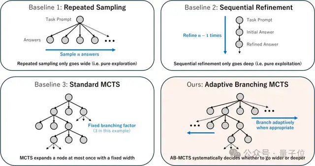 相反,在搜索树的每个节点上,AB-MCTS会自适应地决定是探索(“变宽”)通过生成新的候选响应,还是利用(“变深”)通过改进现有的响应,利用外部反馈信号。