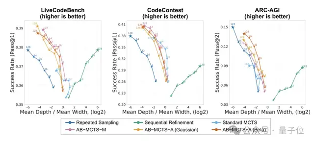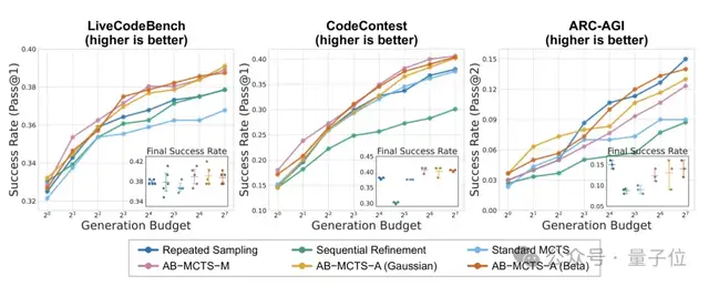 上图左侧和中部报告了GPT-4o在LiveCodeBench和CodeContest上的成功率与生成预算的关系,可以看到,所有方法在计算预算增加时都表现出性能提升。在这两个基准测试中,AB-MCTS算法通常优于基线方法。