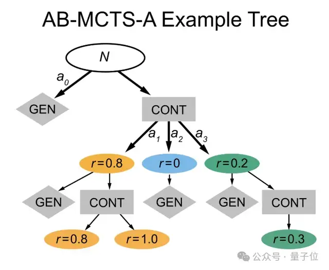 为了充分利用MCTS的无界分支的潜在性能提升,AB-MCTS允许那些已经扩展过一次的节点再次被扩展并进一步分支,并引入GEN节点来明确表示生成新子节点的动作。