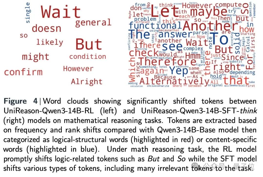 同样的,Token分布偏移分析表明RL训练选择性地调整了逻辑结构词条。而SFT会同时扰乱逻辑和不相关的词条,从而可能损害泛化能力。