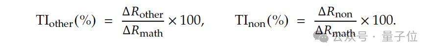 通过“其他推理”或“非推理”任务组的相对增益,分别除以数学任务组的相对增益。这样,TI就清晰反映了数学能力的提升在多大程度上能迁移到其他领域。
