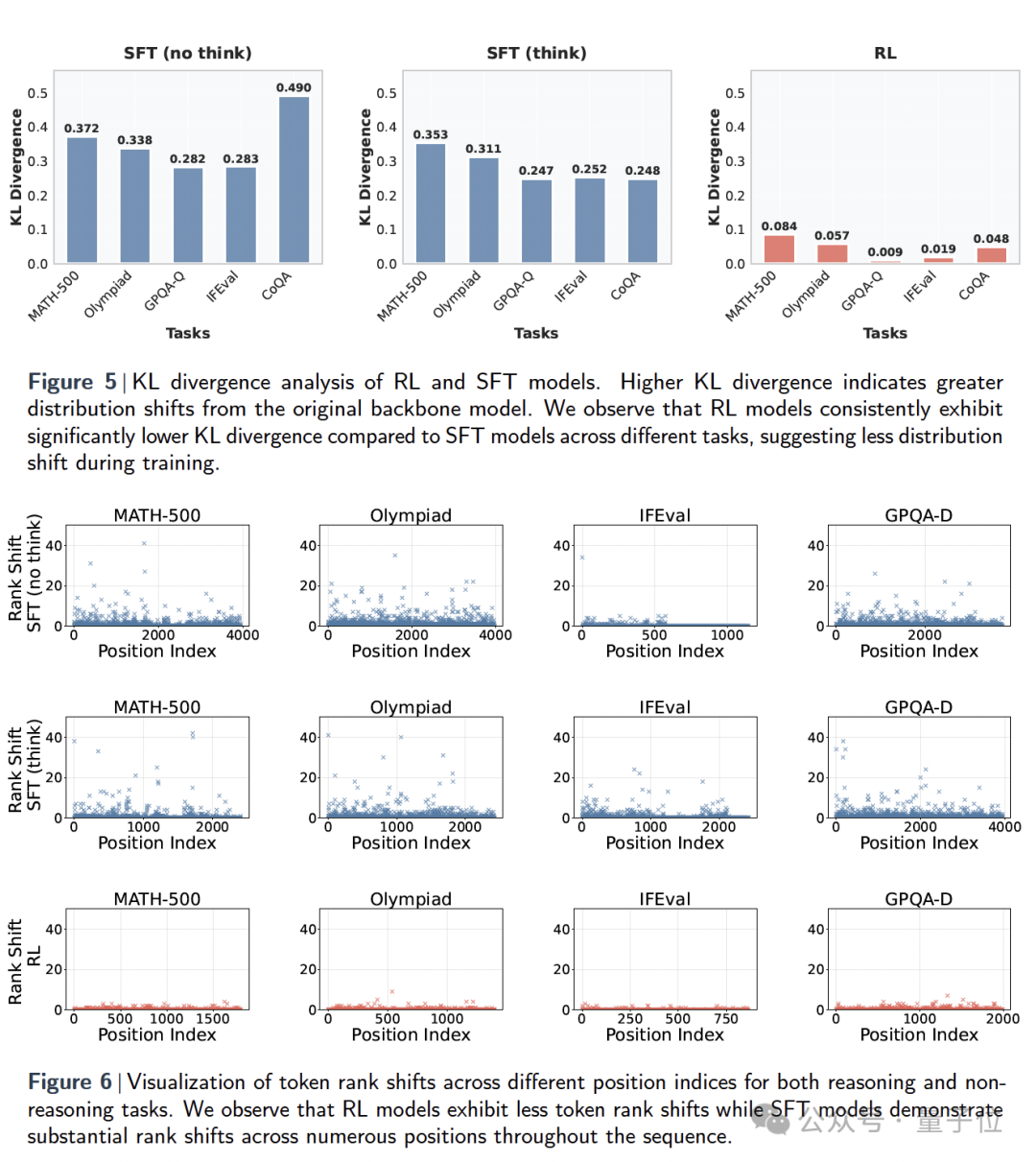 此外,RL模型在推理和非推理任务上的KL散度均显著低于SFT模型(KL散度越高,偏移越大)。