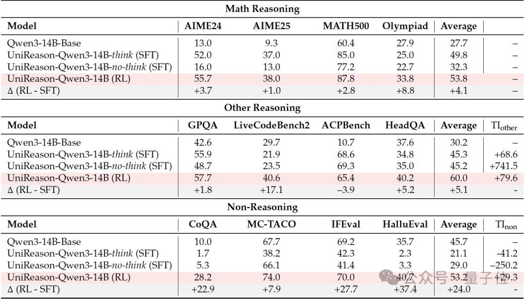 实验先计算模型在每个benchmark任务上相比基线模型(Qwen3-14B-Base)的性能提升幅度,再将这个提升除以基线模型在该任务上的分数,以此得到相对提升的百分比,最后对同一组内所有任务的相对提升求均值,得到该任务组整体的相对增益。