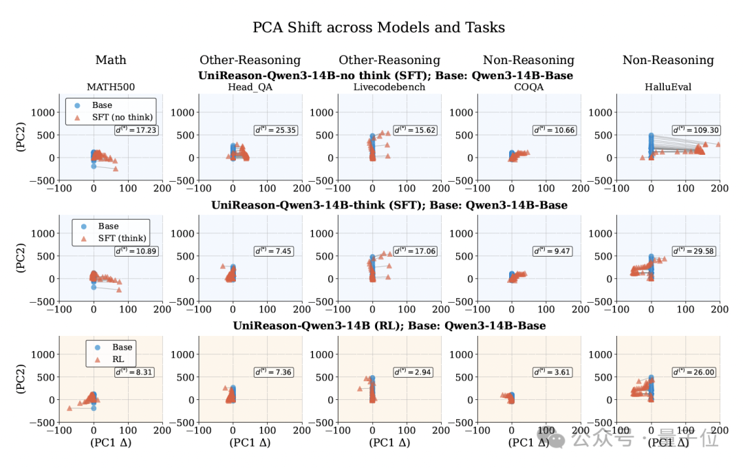 通俗来说,通过PCA偏移分析,就能够得知模型在后训练阶段,究竟是既保留了原有的知识,又在具体领域变得更强了,还是学了新的就忘了旧的。