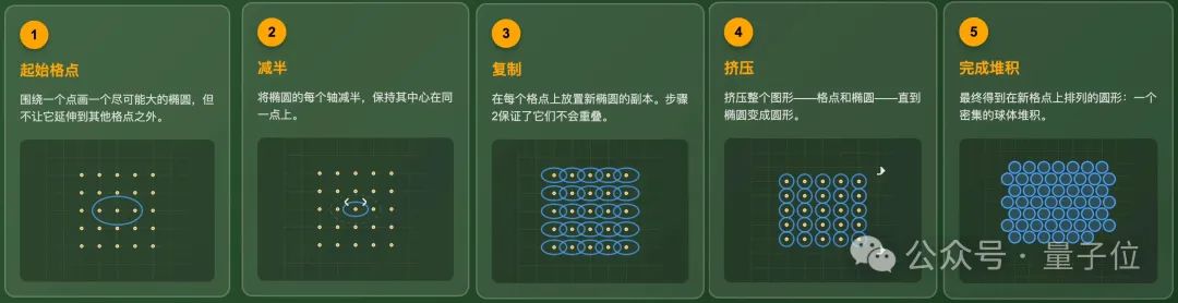 罗杰斯还提出了一种算法,可以利用这个椭球体作为起点来构建密集的球体堆积。