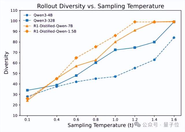 Rollout阶段的多样性主要通过topp、topk与温度t来调控。当前大多数工作都采用topp=1.0和topk=-1,这已经达到了最大的多样性,但采样温度t还没有统一的设置。