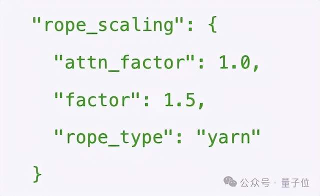 具体实现上,研究团队采用了YaRN作为外推方法,并设置扩展因子为1.5,如下配置所示: