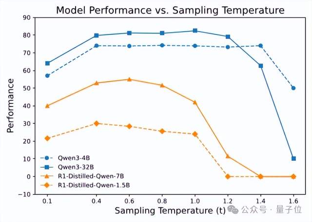 Polaris团队发现模型性能随温度升高呈现“低-高-低”的趋势。例如,把采样温度设置成1.0,对于Deepseek-R1-distill系列模型过高了,而对于Qwen3系列来说又有点低。
