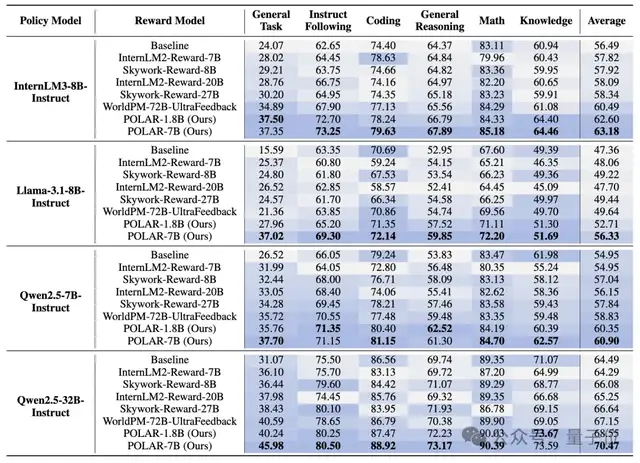在强化微调实验中,POLAR持续优于SOTA的开源奖励模型。