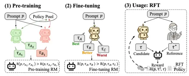△POLAR的两阶段训练(预训练和偏好微调)以及在RFT中的使用方法