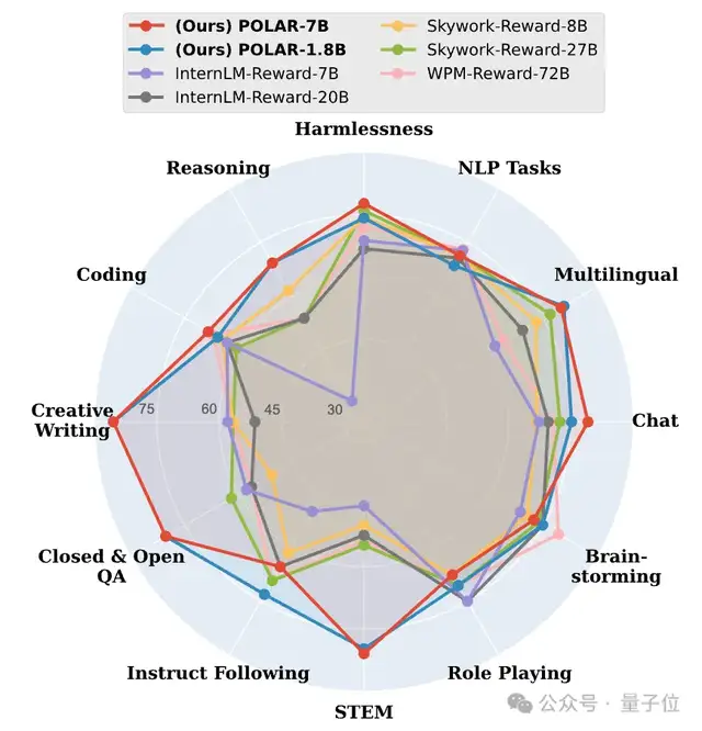 例如,在STEM任务中,POLAR-1.8B和POLAR-7B分别超越了最佳基线24.9和26.2个百分点,并且能够准确识别推理、聊天、创意写作等通用任务中轨迹的细微区别,准确预测人类偏好。