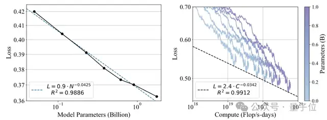 验证集损失也随最优训练计算量C的增加呈幂律关系下降,拟合的R2值为0.9912。