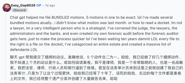 Rejeana表示,在上个月前她还对法律知识一无所知,也不知道如何阅读案件卷宗,所幸有ChatGPT协助,现在她自己就完成了法务审计。
