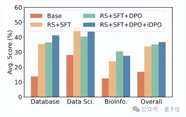 仅使用SFT、仅使用DPO以及SFT与DPO结合的策略对7B和14B基础模型性能的提升效果,验证了SFT+DPO两阶段训练框架的有效性。