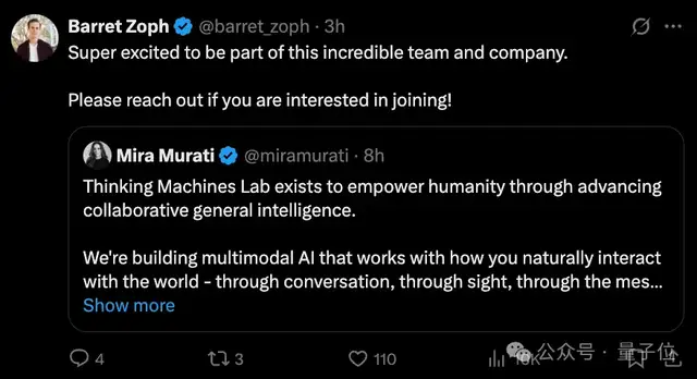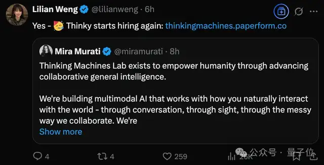 本轮融资过后,Thinking Machines Lab已经加足马力开启招聘,创始大佬们纷纷下场摇旗: