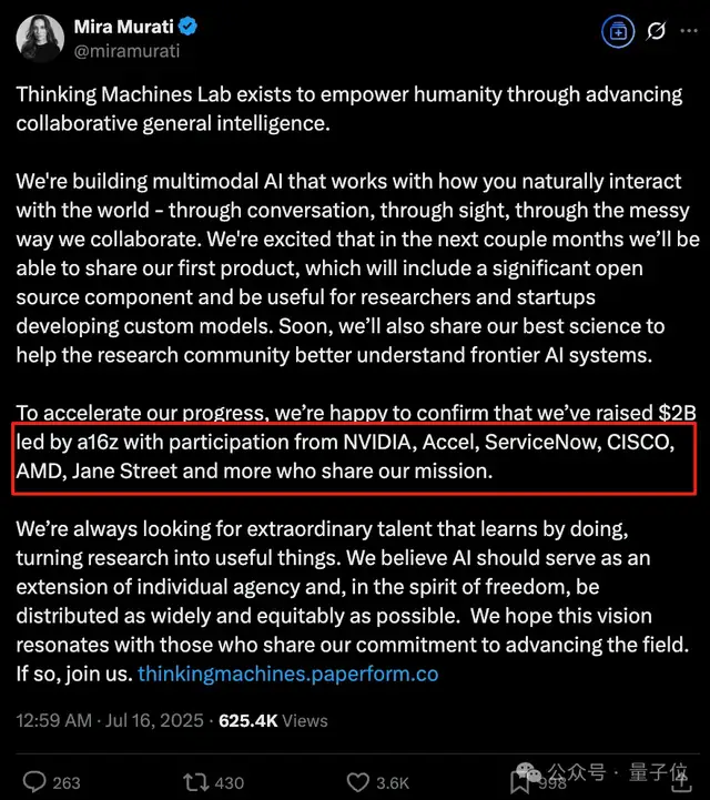 OpenAI前CTO Mira创业公司,Thinking Machines Lab——思考机器实验室,刚刚公告了首款融资情况: