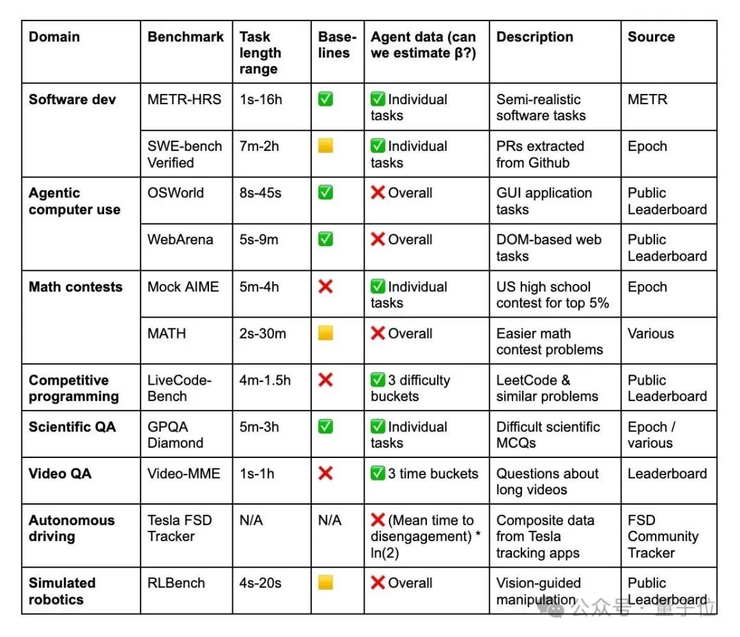 为了证明上面的问题,报告选取了9个benchmark,包括软件开发(METR‑HRS、SWE‑bench)、计算机使用(OSWorld、WebArena)、数学竞赛(Mock AIME、MATH)、编程竞赛(LiveCode-Bench)、科学问答(GPQADiamond)、视频理解(Video‑MME)、自动驾驶(Tesla FSD)和机器人仿真(RLBench)。