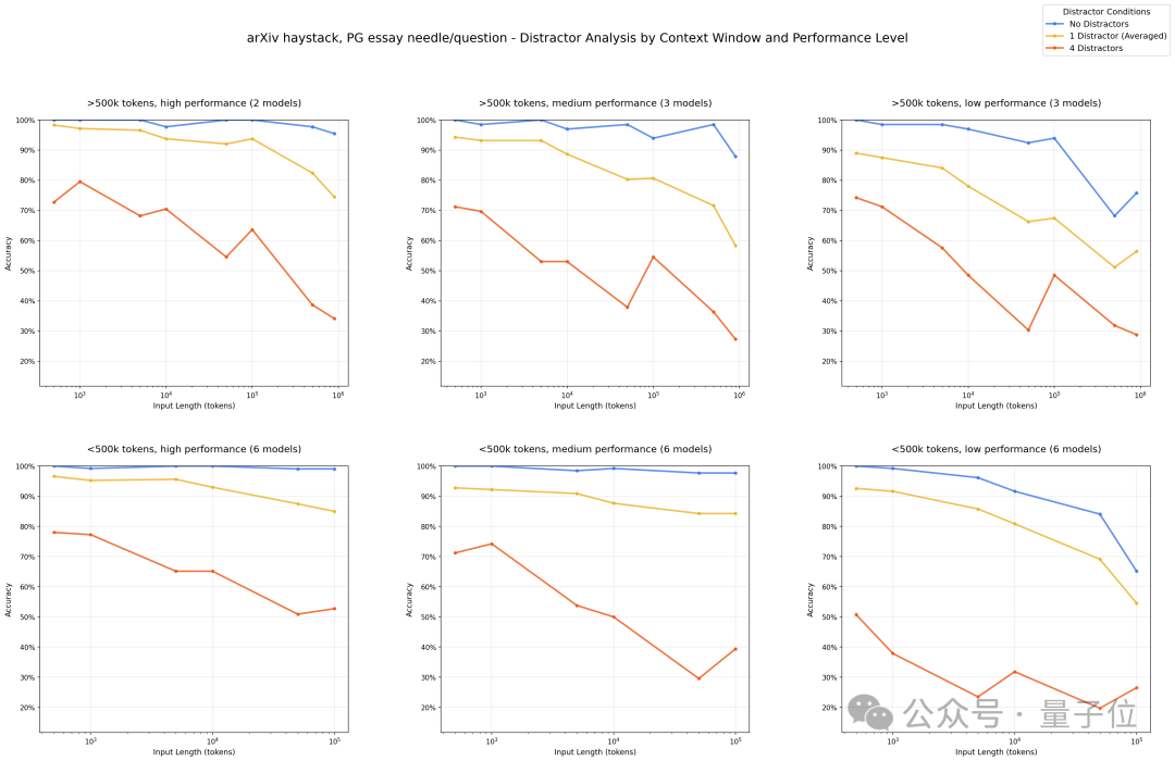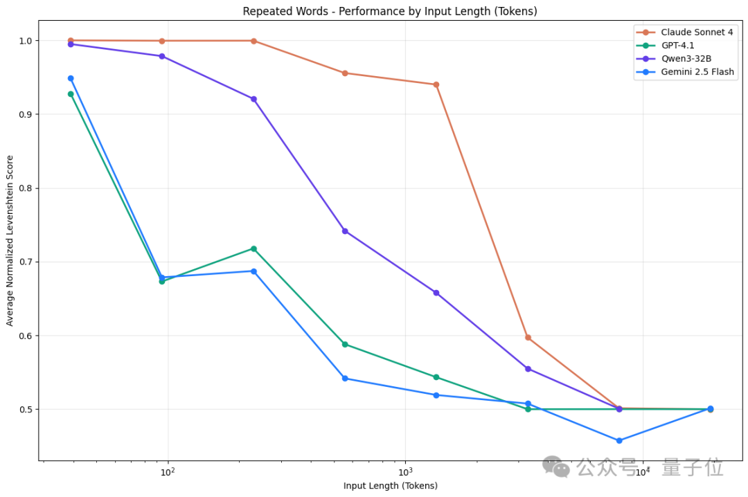 实验还首次系统性地揭示了输入长度对模型性能并非均匀影响,不同模型性能可能在某一tokens长度上准确率发生骤降。