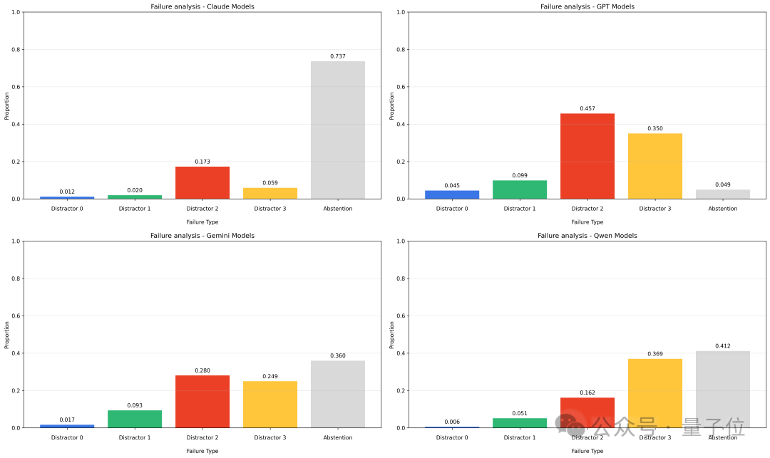此外,模型对干扰项的响应存在差异:Claude系列倾向于在不确定时弃权(明确表示无法回答),幻觉率较低;GPT系列则更可能生成自信但错误的答案,受干扰影响更明显;Gemini和Qwen模型的表现波动较大,易受干扰项数量和输入长度的双重影响。