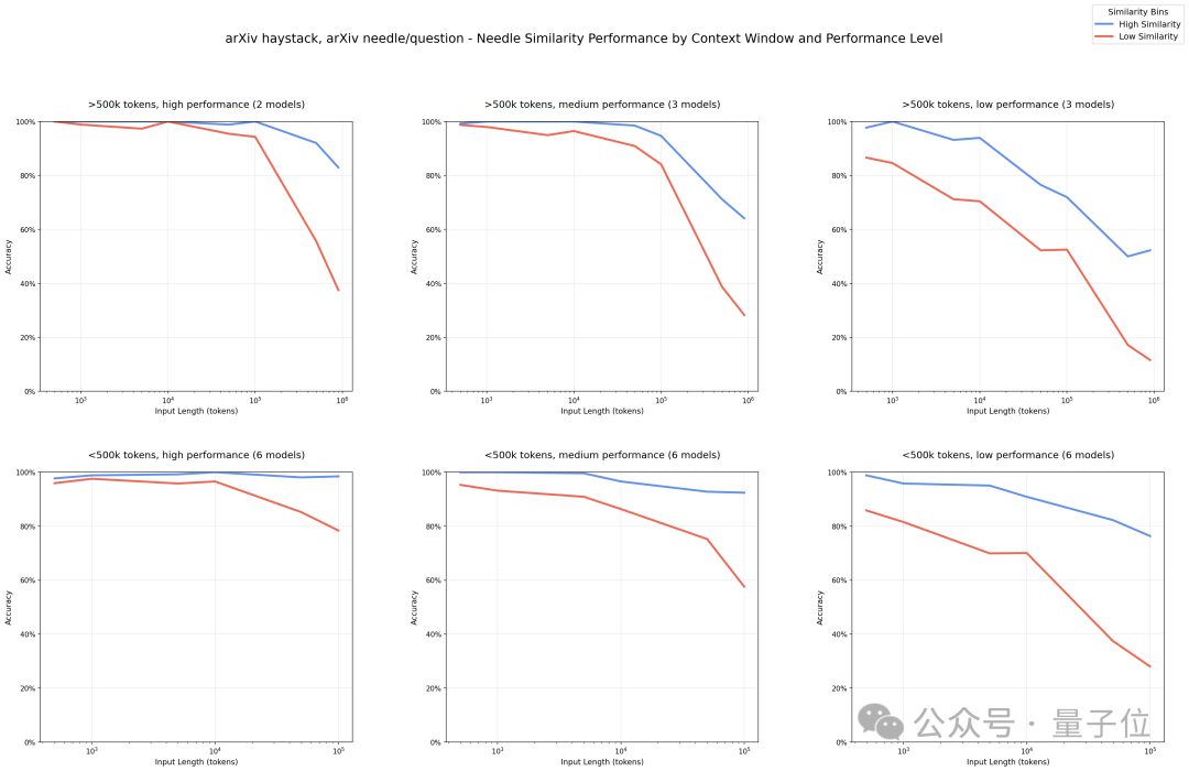 高相似度组在10⁴tokens 时准确率约60%-80%,低相似度组降至40%-60%,高性能模型虽在短输入时表现更好,长输入下仍难避免衰减。