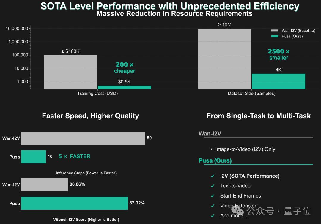 Pusa V1.0在基础大模型Wan2.1-T2V-14B的基础上引入向量时间步适应(vectorized timestep adaptation,VTA )机制,仅使用3860对视频-文字数据、约500美元成本进行微调,就在在图像转视频 (I2V) 超越了Wan-I2V-14B,实现了SOTA,并解锁了诸多零样本任务能力。