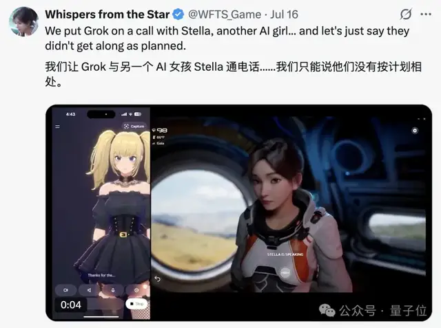 此外,官方也整大活,蹭马斯克热度,让Grok Ani体验游戏,AI女孩对话AI女孩。