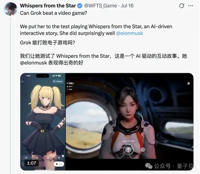 次日,蔡浩宇的AI游戏《Whispers from the Star》官方账号便在X上发布了一段用Grok Ani试玩该游戏的视频,并直接@了马斯克。