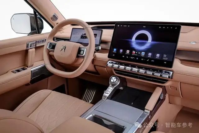 M817座舱设计风格是硬朗的横平竖直线条,搭配以金属材质的面板,棱角分明。悬浮液晶仪表尺寸为10.25英寸,中控屏的尺寸达到了15.6英寸。