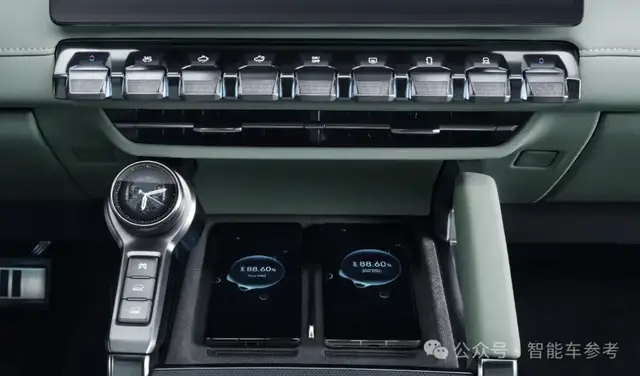在中控屏下方,还有金属质琴键式物理按键,用于控制车辆的空调系统、底盘升降及部分越野/驾驶功能。