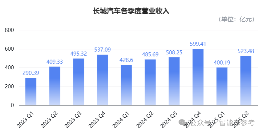 分季度看,首先是营收,长城第二季度的营业收入为523.48亿元,同比上涨7.8%,环比增长30.8%。