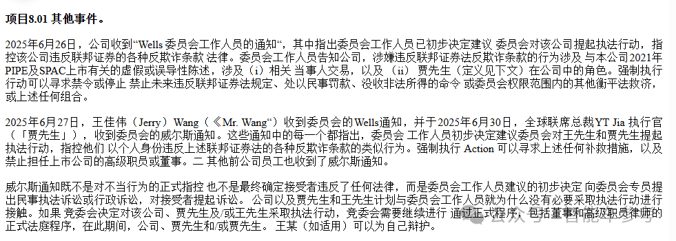 通知表示,SEC内部已形成初步意见,建议对FF、上述两位现任高管,以及两位前员工启动执法程序。