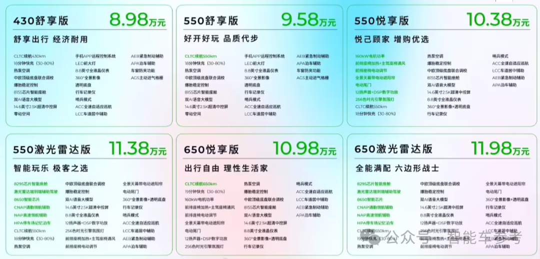 根据三种续航版本,B01总共提供了6款不同价格配置,价格区间是8.98万元~11.98万元,比预售时的10.58-13.58万元整体便宜1.6万。