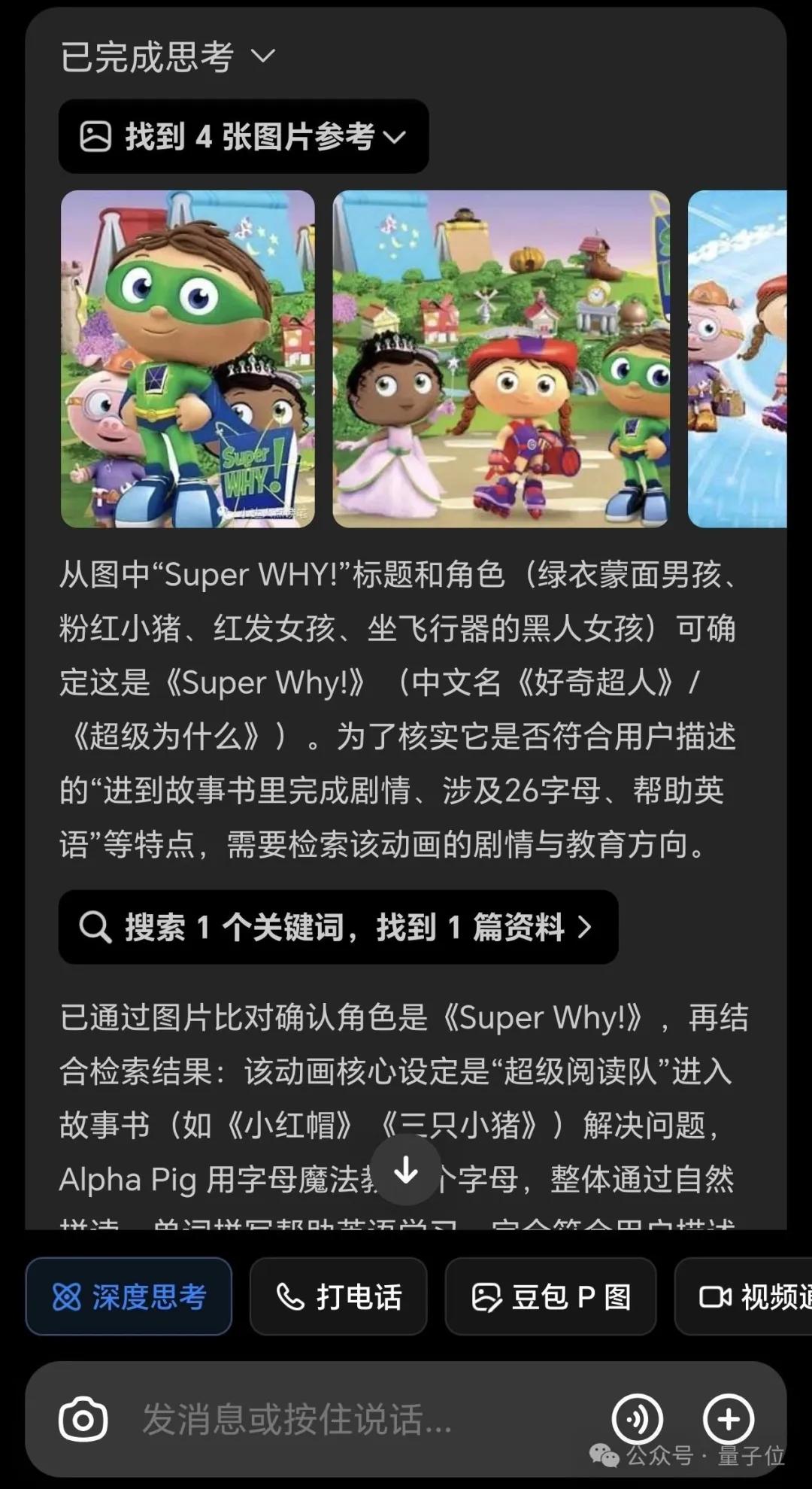 而就是这样寥寥几句,豆包APP通过多轮关键词检索和图片分析,帮忙成功找到了《Super Why》这部童年经典。