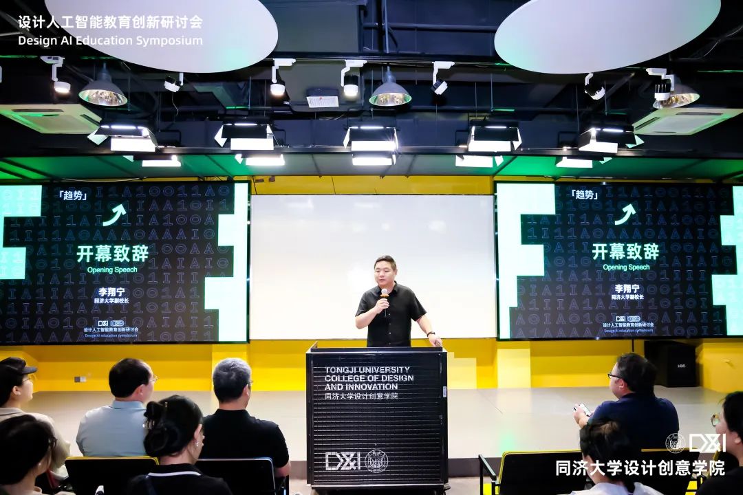同济大学设计创意学院院长胡飞介绍了同济大学设计人工智能领域发展,包括人才培养体系、行动计划等,强调其为学科创新的重要基础。