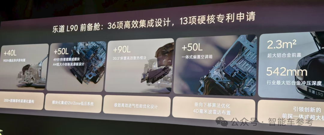 仅仅一个前备箱,就包含了13项专利, 包括但不限于49合1热管理集成模块、一体式偏置空调箱和30.5°斜置高效散热模块。