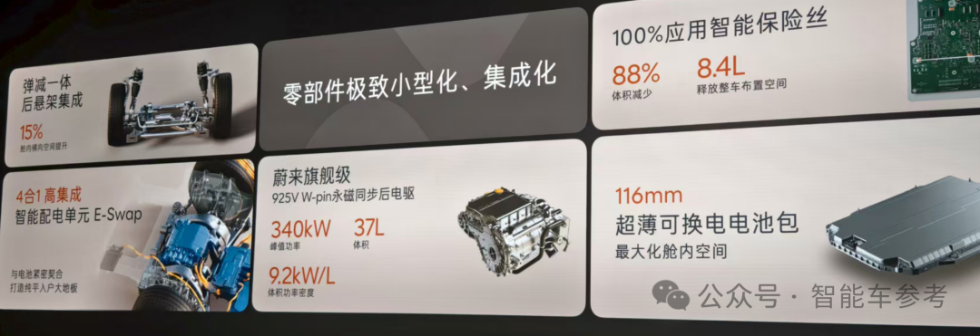 放大到整车,更是用了很多高集成度零部件,比如ET9同款后电机占用空间小,100%应用智能保险丝,弹减一体后悬架集成。900V架构让补能速度更快的同时,也让整车线束更细,占用空间更少。