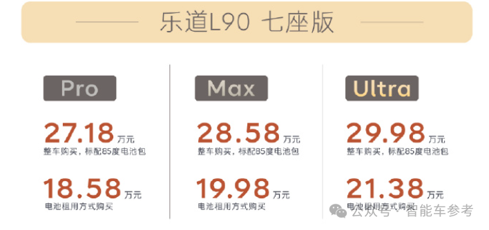 最后来看下配置和价格,乐道L90有6座和7座两个版本,每个版本都有Pro、Max和Ultra三个车型,全系标配85度电池包,两驱续航是605km,四驱版续航是570km。