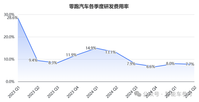 再看零跑,上半年的研发费用率(研发费用/总收入)为7.69%,同比下降了5.4个百分点。