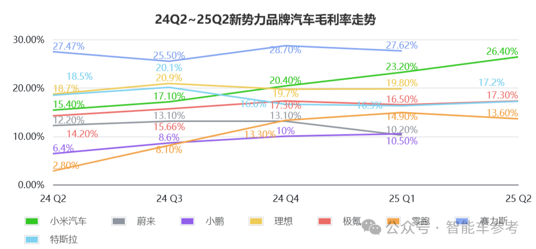 小米汽车的毛利率,在这一季度更加惊人,Q2的汽车毛利率已经达到26.4%,同比增长了11个百分点,从去年四季度起,就已经超越特斯拉、理想等,领先多数新势力,达到头部水平。