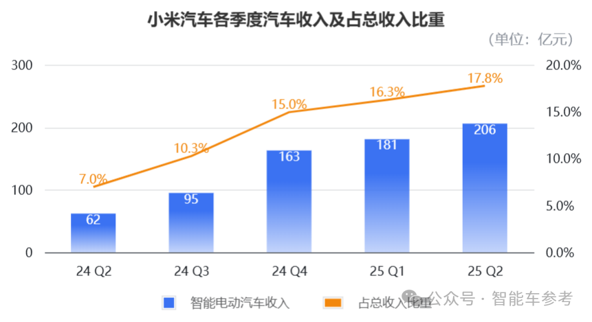 而智能电动汽车的Q2收入为206亿元,占小米总营收的比例,已经从去年Q2的7%增长到了如今的17.8%。