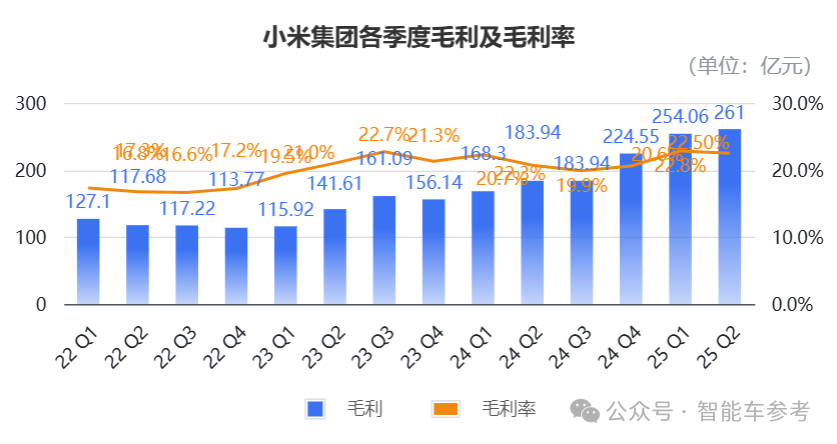 第二季度毛利为261亿元,较上年同期的184亿元增长41.9%;同期毛利率为22.5%,同比增长了1.8个百分点。
