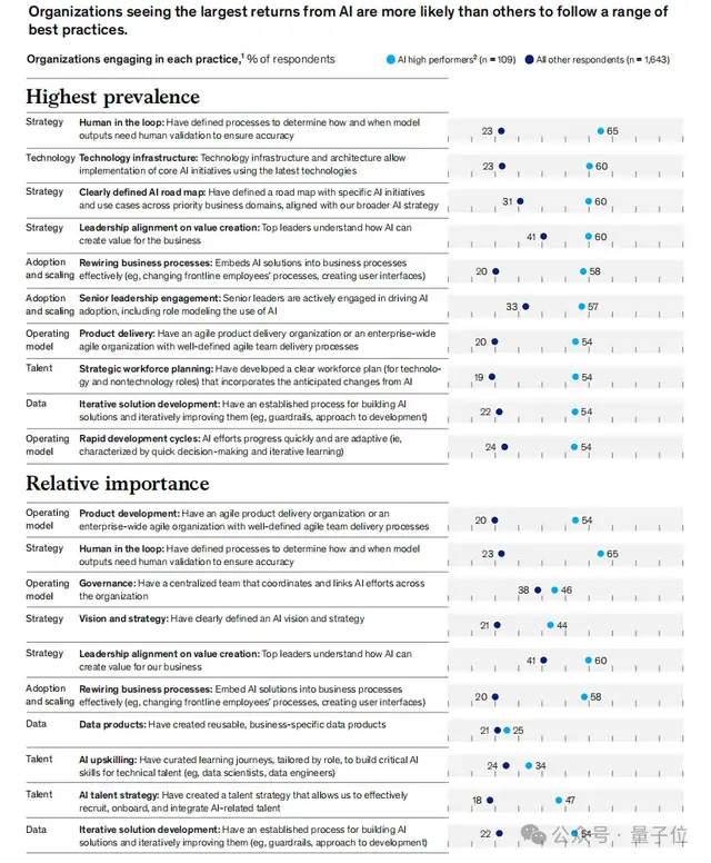 比如,在战略层面,高绩效企业中有60%已绘制明确的AI路线图(一般企业的一半)。
