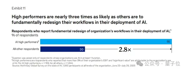 在AI真正落地的环节上,高绩效员工从从根本上重新设计工作流程的可能性高达55%,约其他人的三倍(2.8×)。