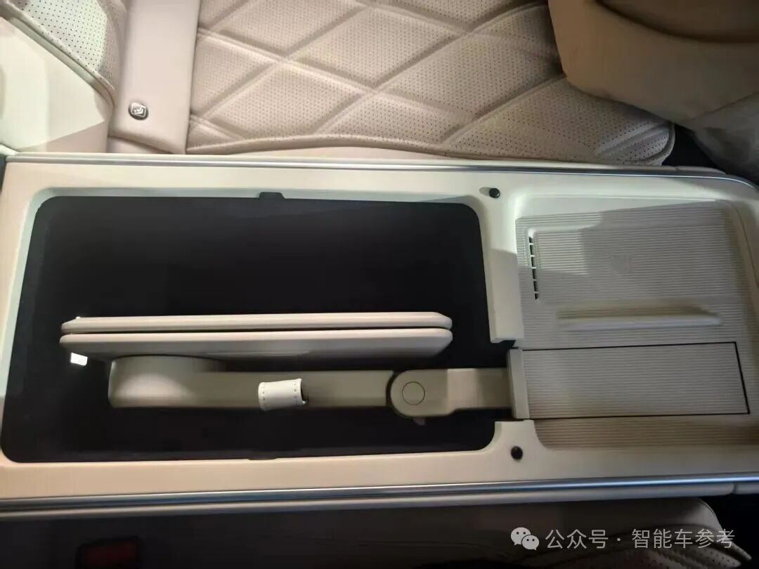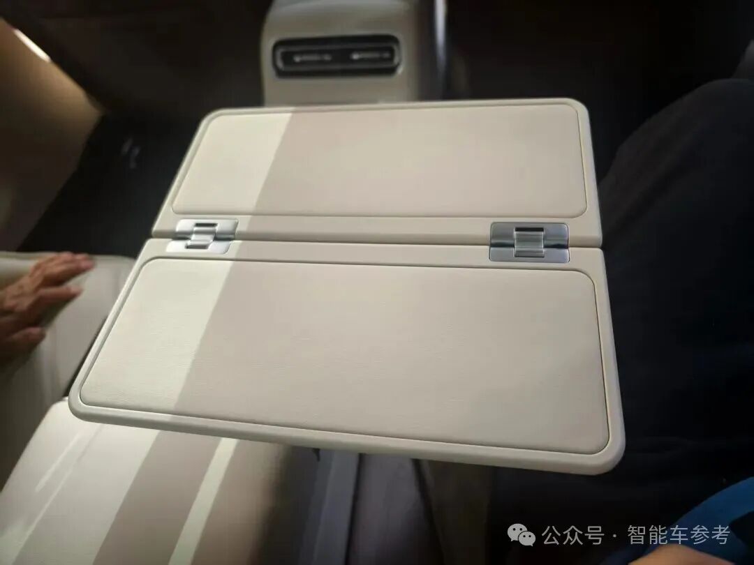 四座版后排后还有一个储物格,里面藏着一个折叠小桌板。