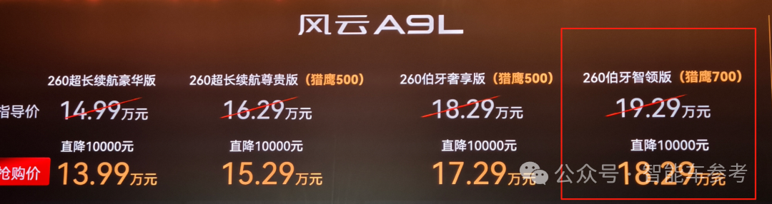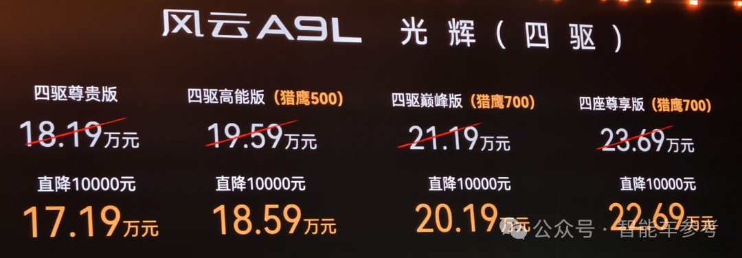 一个是四驱的光辉车系,入门版现在的价格是17.19万元,加1.4万元有更多舒适性配置,比如后排隔音玻璃、更多的音响喇叭、主驾座椅按摩和方向盘加热,以及猎鹰500(高速NOA)。